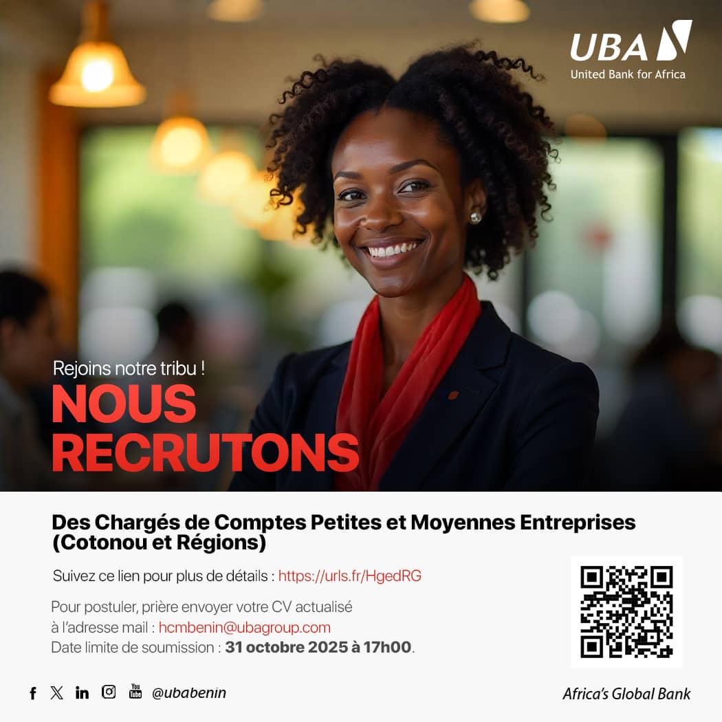 Pour postuler, prière envoyer votre CV actualisé et une lettre de motivation à l’adresse mail hcmbenin@ubagroup.com au plus tard le 31 octobre 2025 à 17h00 avec en objet « Candidature au poste de Chargé de Comptes Petites et Moyennes Entreprises _Cotonou & Régions ».