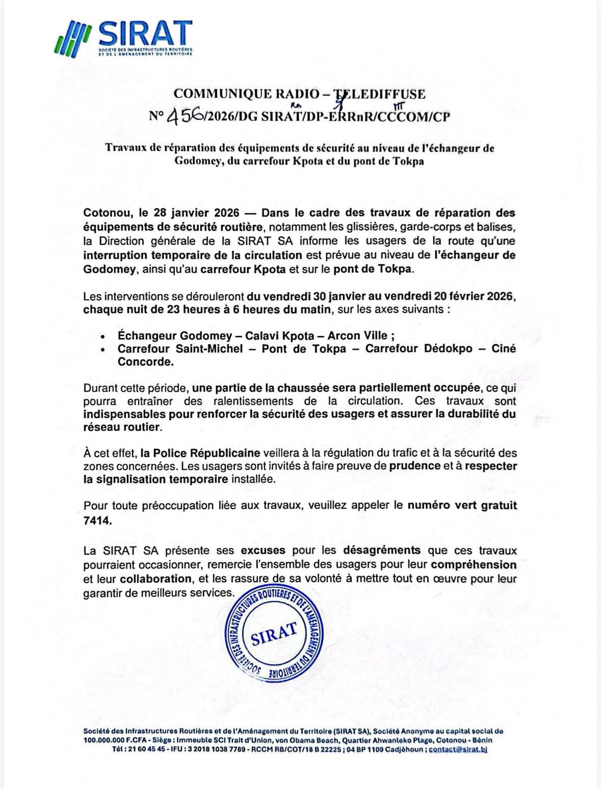 La Direction Générale de la Société des Infrastructures Routières et de l’Aménagement du Territoire (SIRAT) annonce des T𝐫𝐚𝐯𝐚𝐮𝐱 𝐝𝐞 𝐫é𝐩𝐚𝐫𝐚𝐭𝐢𝐨𝐧 𝐝𝐞𝐬 é𝐪𝐮𝐢𝐩𝐞𝐦𝐞𝐧𝐭𝐬 𝐝𝐞 𝐬é𝐜𝐮𝐫𝐢𝐭é 𝐚𝐮 𝐧𝐢𝐯𝐞𝐚𝐮 𝐝𝐞 𝐥’é𝐜𝐡𝐚𝐧𝐠𝐞𝐮𝐫 𝐝𝐞 𝐆𝐨𝐝𝐨𝐦𝐞𝐲, 𝐝𝐮 𝐜𝐚𝐫𝐫𝐞𝐟𝐨𝐮𝐫 𝐊𝐩𝐨𝐭𝐚 (Abomey-Calavi) 𝐞𝐭 au niveau 𝐝𝐮 𝐩𝐨𝐧𝐭 𝐝𝐞 𝐓𝐨𝐤𝐩𝐚 (Cotonou).