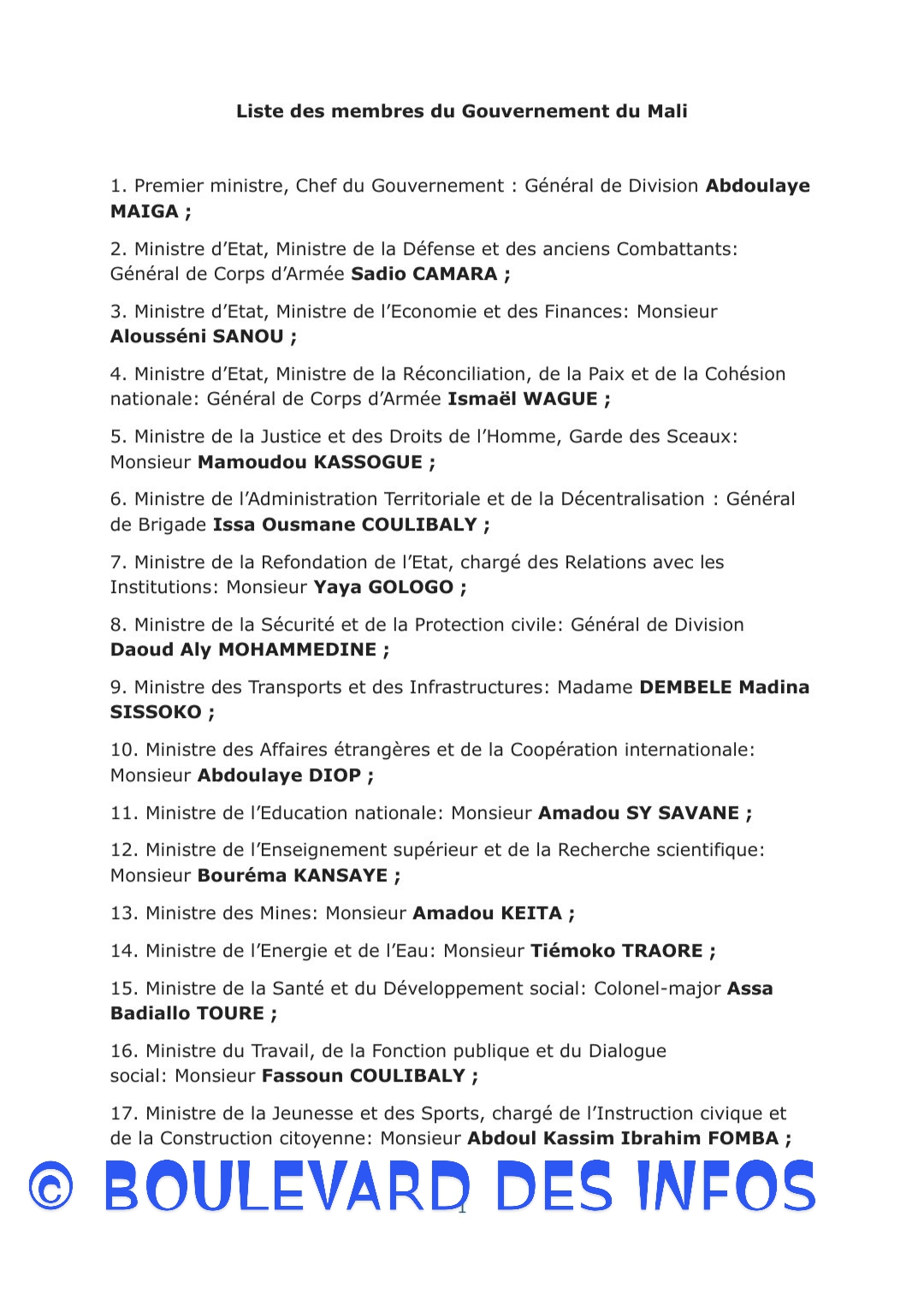 Selon des sources proches du président Goïta, ce réaménagement s’inscrit dans une série d’ajustements institutionnels visant à répondre aux défis sécuritaires, économiques et sociaux persistants au Mali, tout en maintenant la continuité gouvernementale. Voici l’intégralité des membres du nouveau gouvernement.